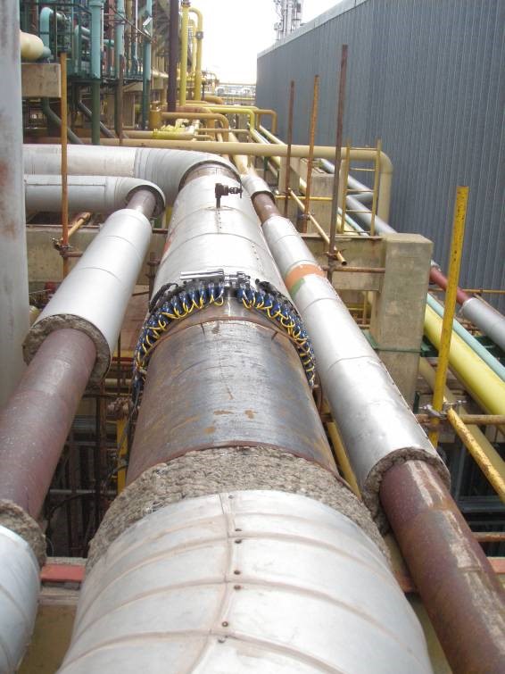 Este sistema permite realizar un barrido del 100% del volumen, detectando pérdidas de metal por corrosión y/o erosión. La tubería puede ser inspeccionada mediante GW no obstante en contrarse en operación, aislada e incluso enterrada. Proporciona la mejor información para la toma de decisiones respecto a continuar operando, reparar o reemplazar. La técnica de Ondas Guiadas utiliza ondas ultrasónicas de baja frecuencia que viajan a lo largo de la tubería, resultando localizadas las áreas afectadas con precisión, en términos de distancia a partir del anillo transductor. Esta técnica de inspección se puede utilizar sin necesidad de andamiaje excesivo y minimizando la necesidad de retirar la aislación de las tuberías.